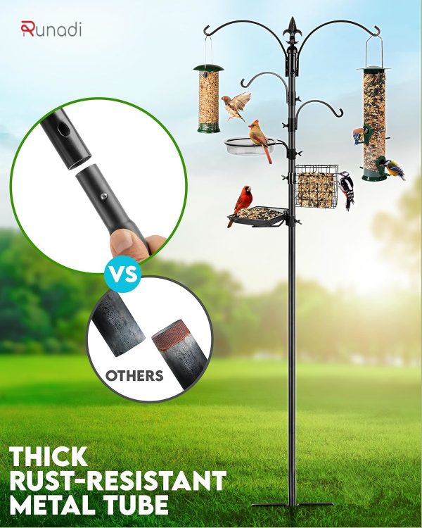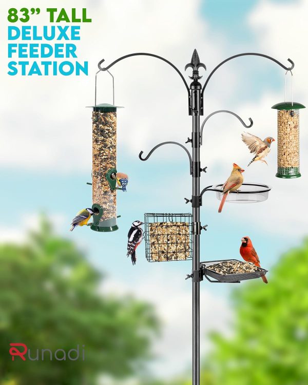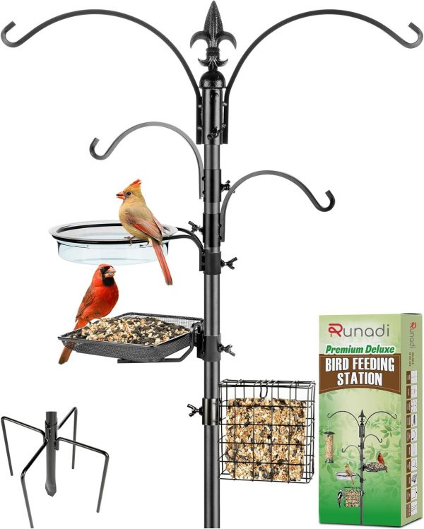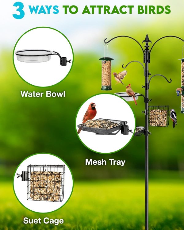 Bird Feeder Stand for Outside, 4-Hooks, 91″ Bird Feeder Station, Multi Bird Feeder Pole Stand Kit with Bird Bath, Mesh Tray & Suet Cage for Wild Birds, Plant Hanger, 5-Prong Base